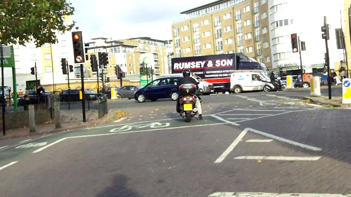 Finally the lights change in our favour and we're off, turning right into York Road. Lane selection is very tricky here. There are two lanes that go left over Wandsworth Bridge, so in theory we want the right-hand lane to go straight on, but if the traffic is actually moving that can be a very dangerous place to be. If the traffic is stationary, you can't get through so you're better off in the bus lane (below):